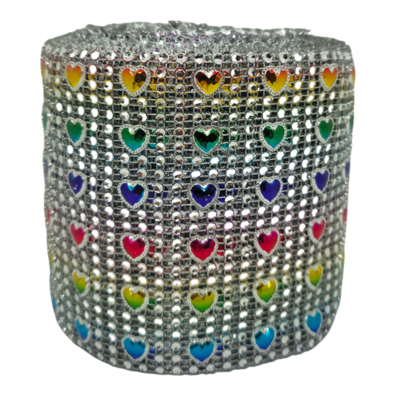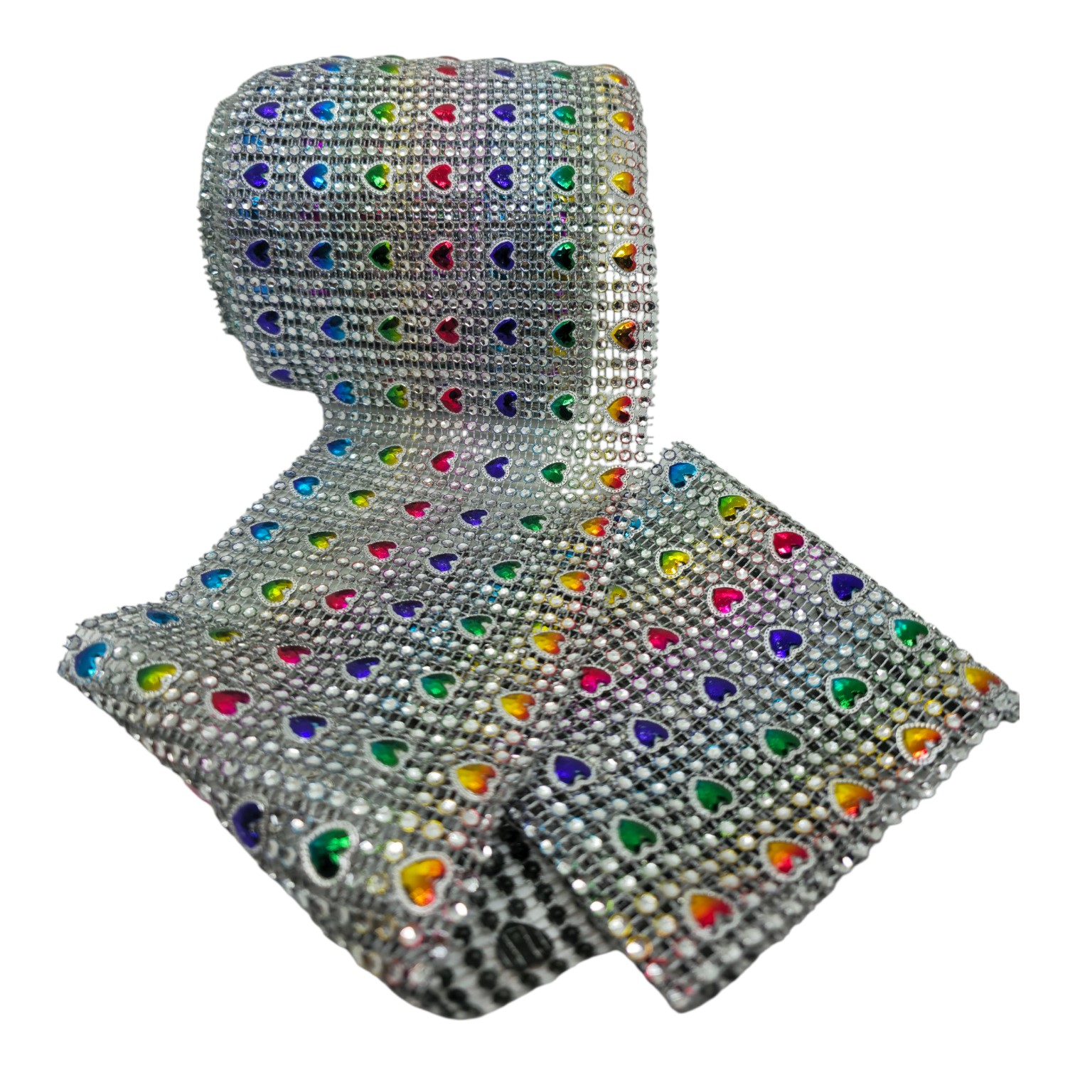 Falso strass fantasía «Corazón multicolor» plateado art.2331 11cm x 9mts – Pieza x 9mts