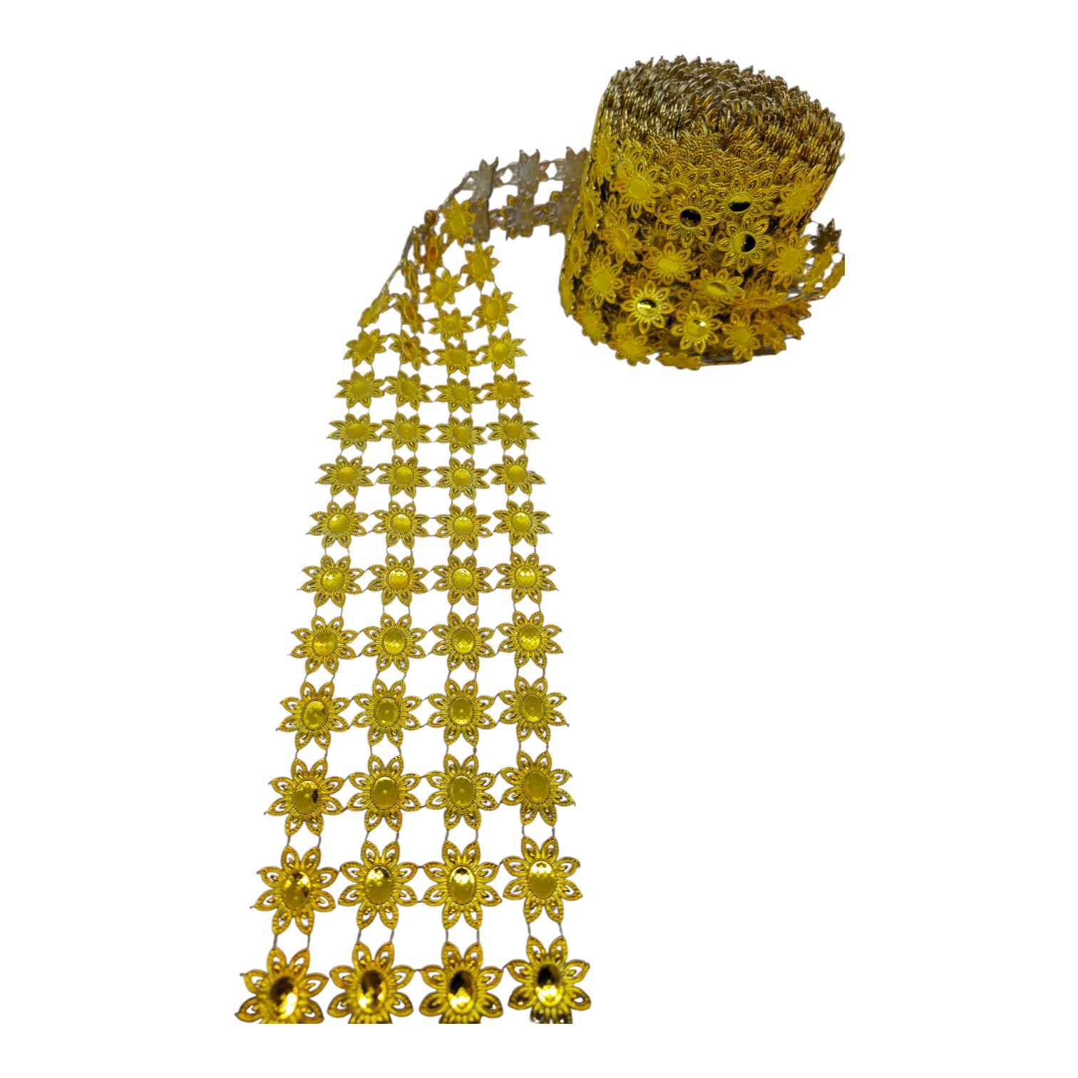 Falso strass fantasía «Flor grande» dorado art.2328 ancho 9cm x 9mts – Pieza x 9mts