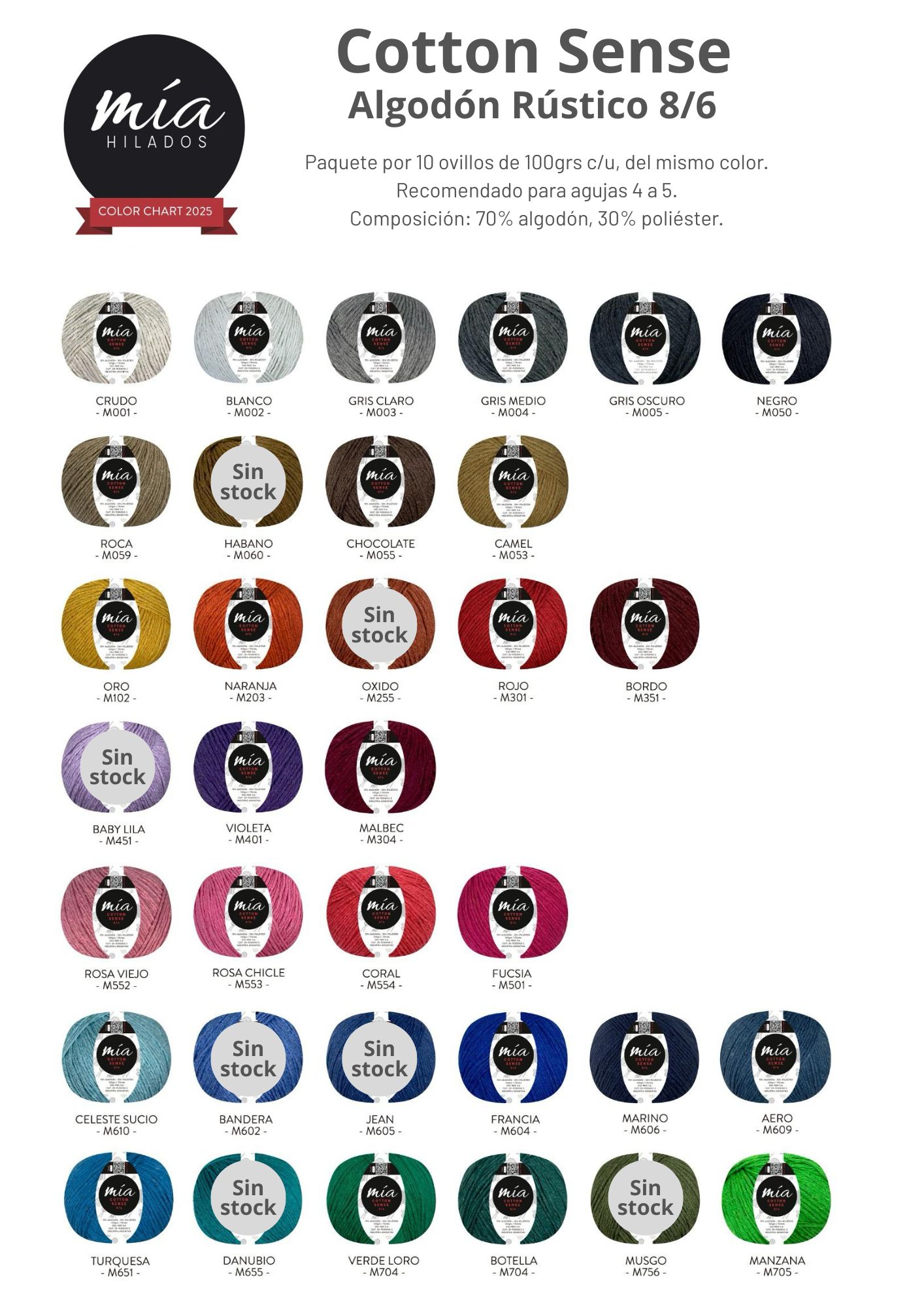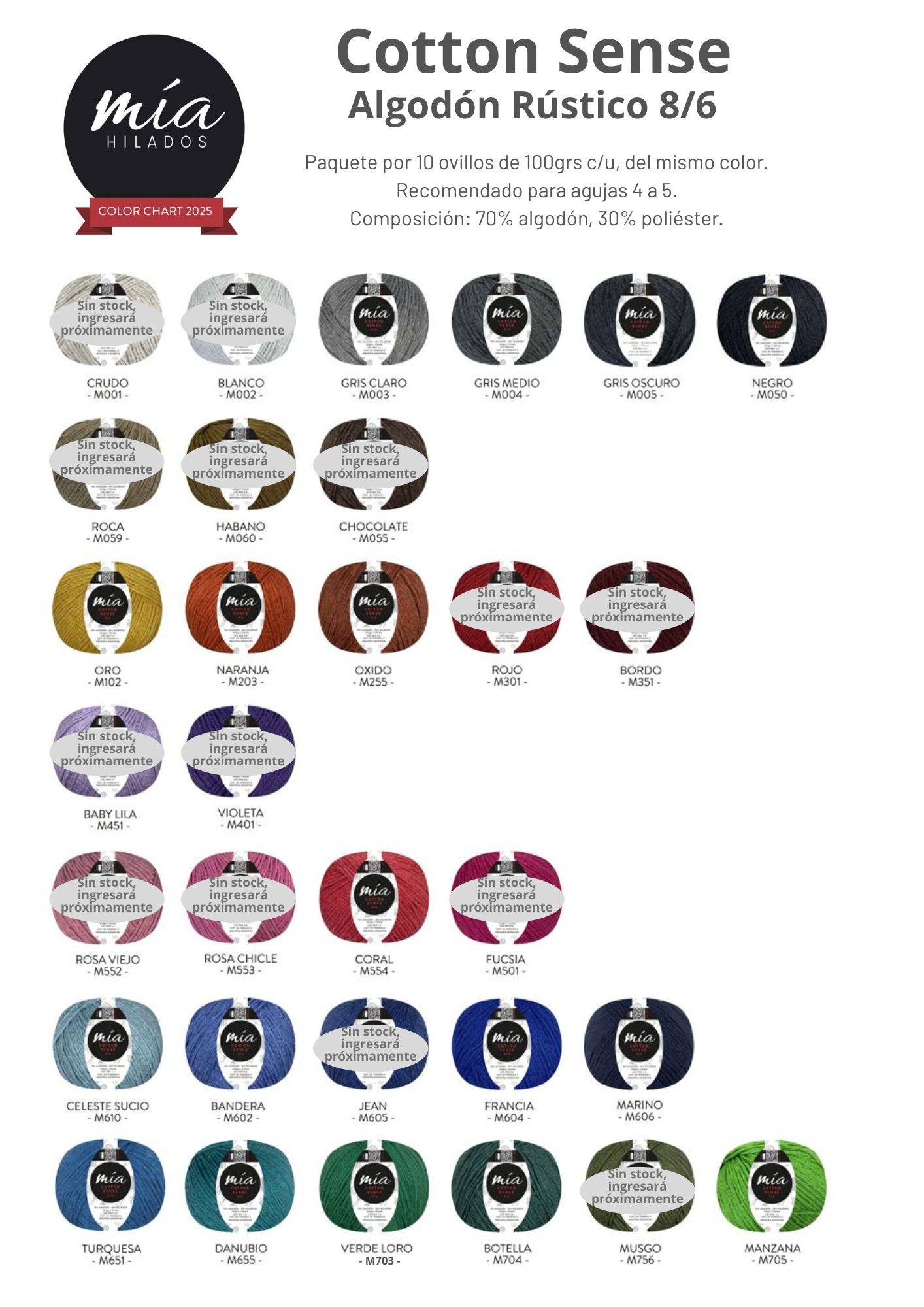 Hilo de algodón Mia Cotton Sense 8/6 por kilo (10 ovillos de 100grs c/u, del mismo color) – El hilo para tejer Cotton Sense de Mía es 70% algodón y 30% poliéster y está recomendado para agujas 4 a 5.