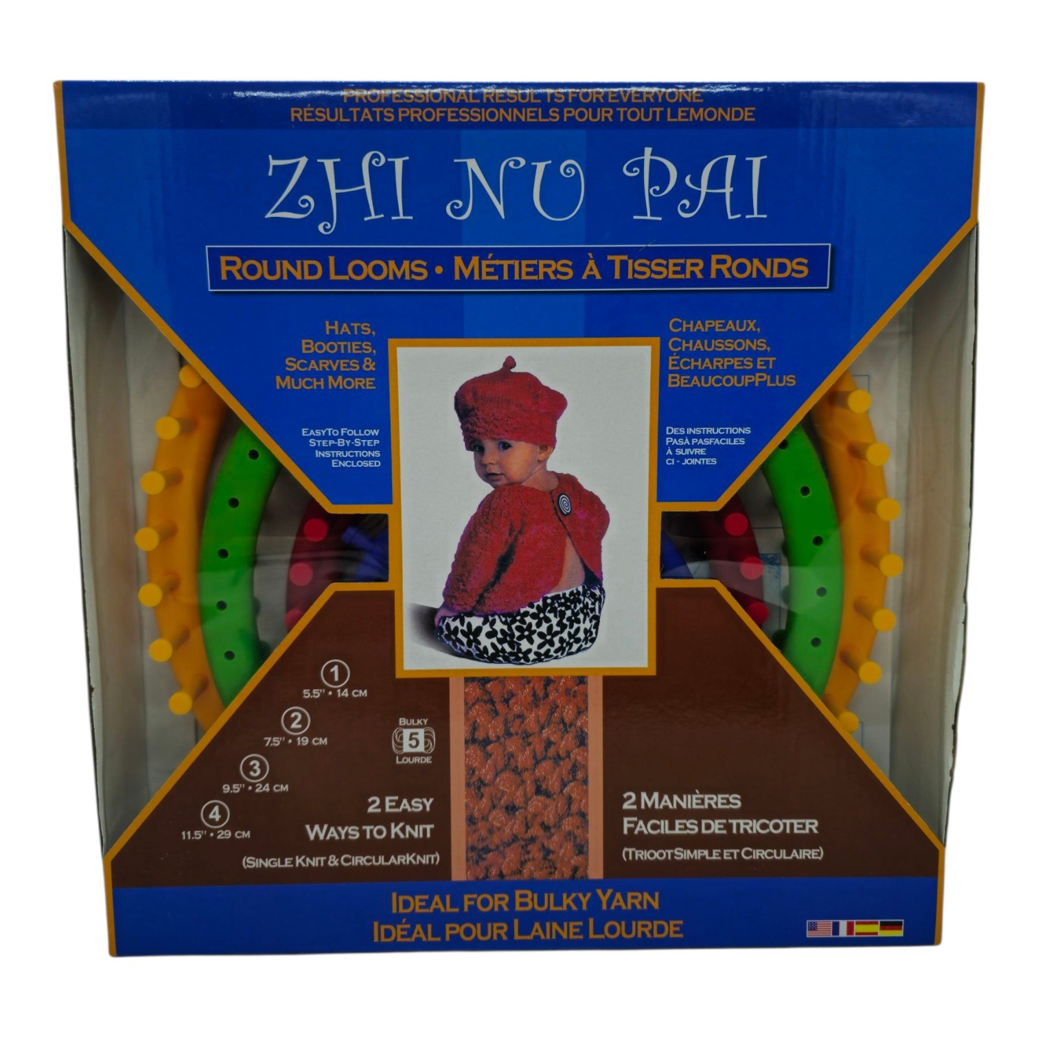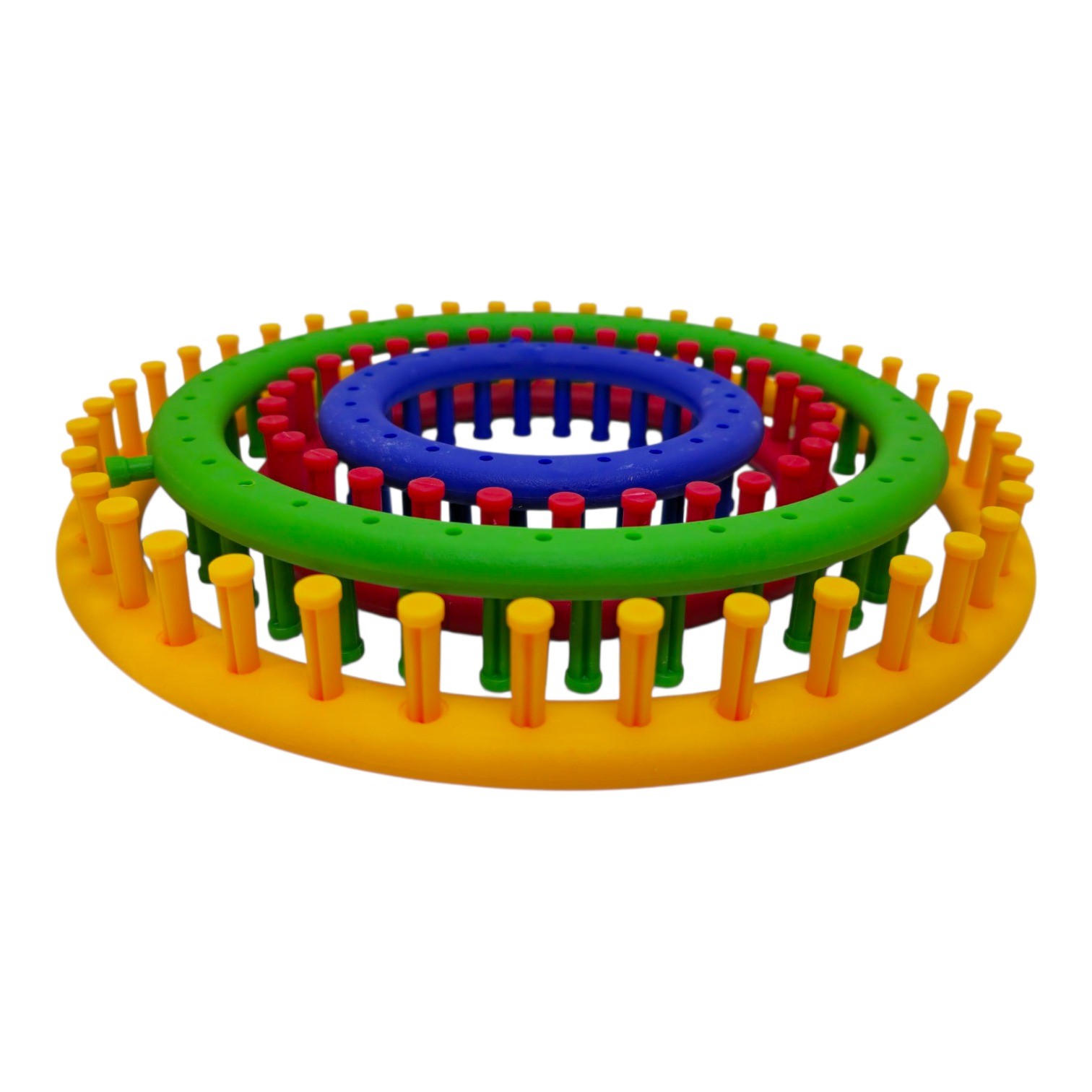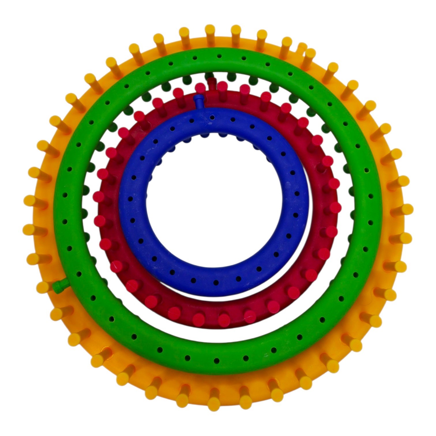 Kit telares plásticos circulares para tejer gorros, bufandas y más (incluye agujas y púa) – El kit de telares circulares de plástico incluye 4 telares de 14cm, 19cm, 24cm y 29cm, más dos agujas plásticas y una púa. Se utiliza paa tejer gorros, bufandas y botitas y se recomienda utilizar lana gruesa.