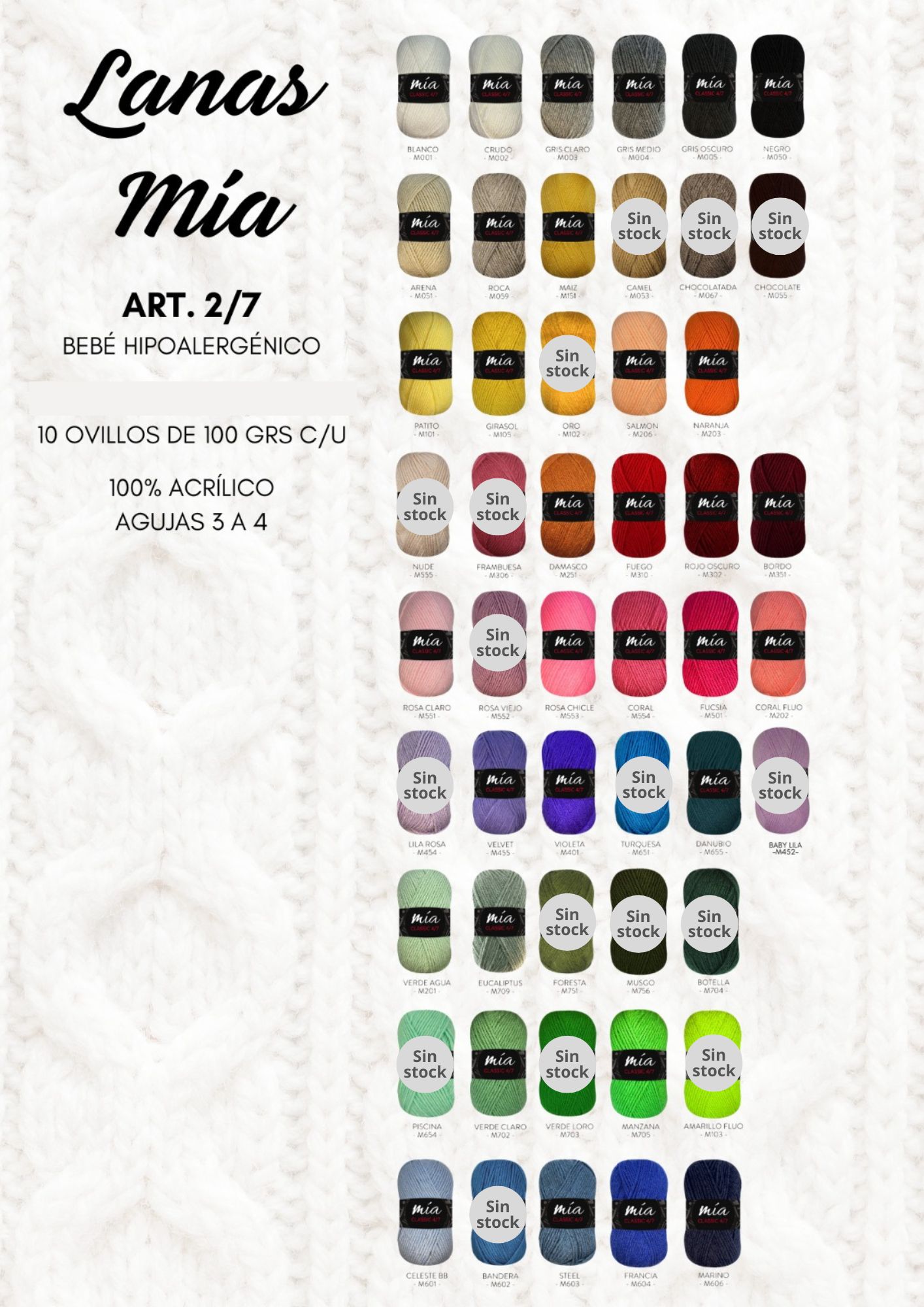Lana Mía Classic 2/7 bebé por kilo (10 ovillos de 100grs c/u, del mismo color) – La lana Mia Classic 2/7 es de 100% acrílico hipoalergénico, recomendada para prendas de bebé. La presentación es en ovillos de 100grs y la bolsa contiene 10 ovillos del mismo color. Se sugiere utilizar agujas 3, 3½ o 4.
