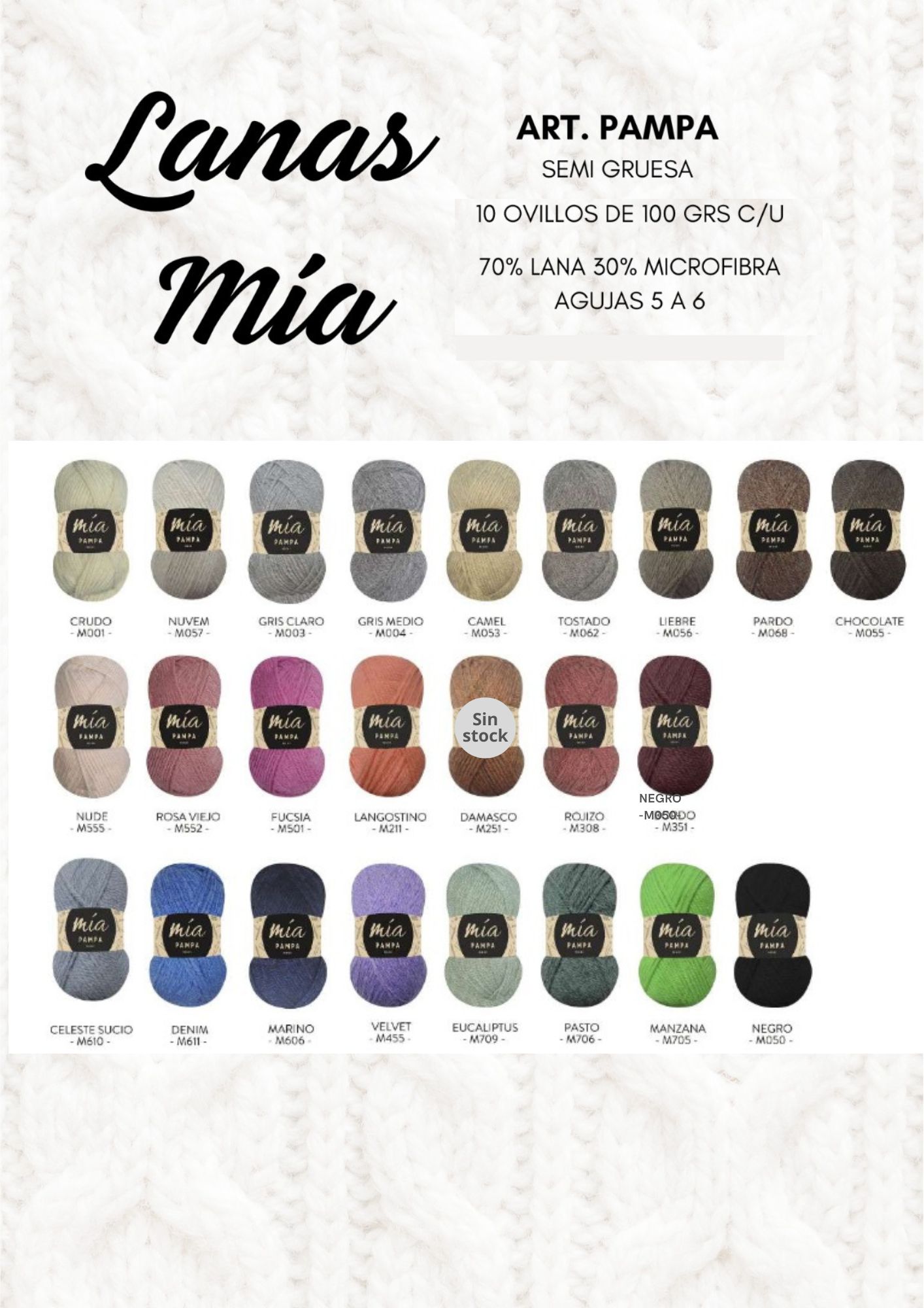 La lana Mía Pampa es semigruesa, compuesta por 70% de lana y 30% de microfibra. Los ovillos son de 100grs c/u (unos 130mts) y la bolsa contiene 10 ovillos iguales. Se recomienda tejer con agujas 5 o 6. Para ver cómo queda tejido, te invitamos a visitar este enlace: https://youtube.com/shorts/DXKNlw7TYPg?feature=shared