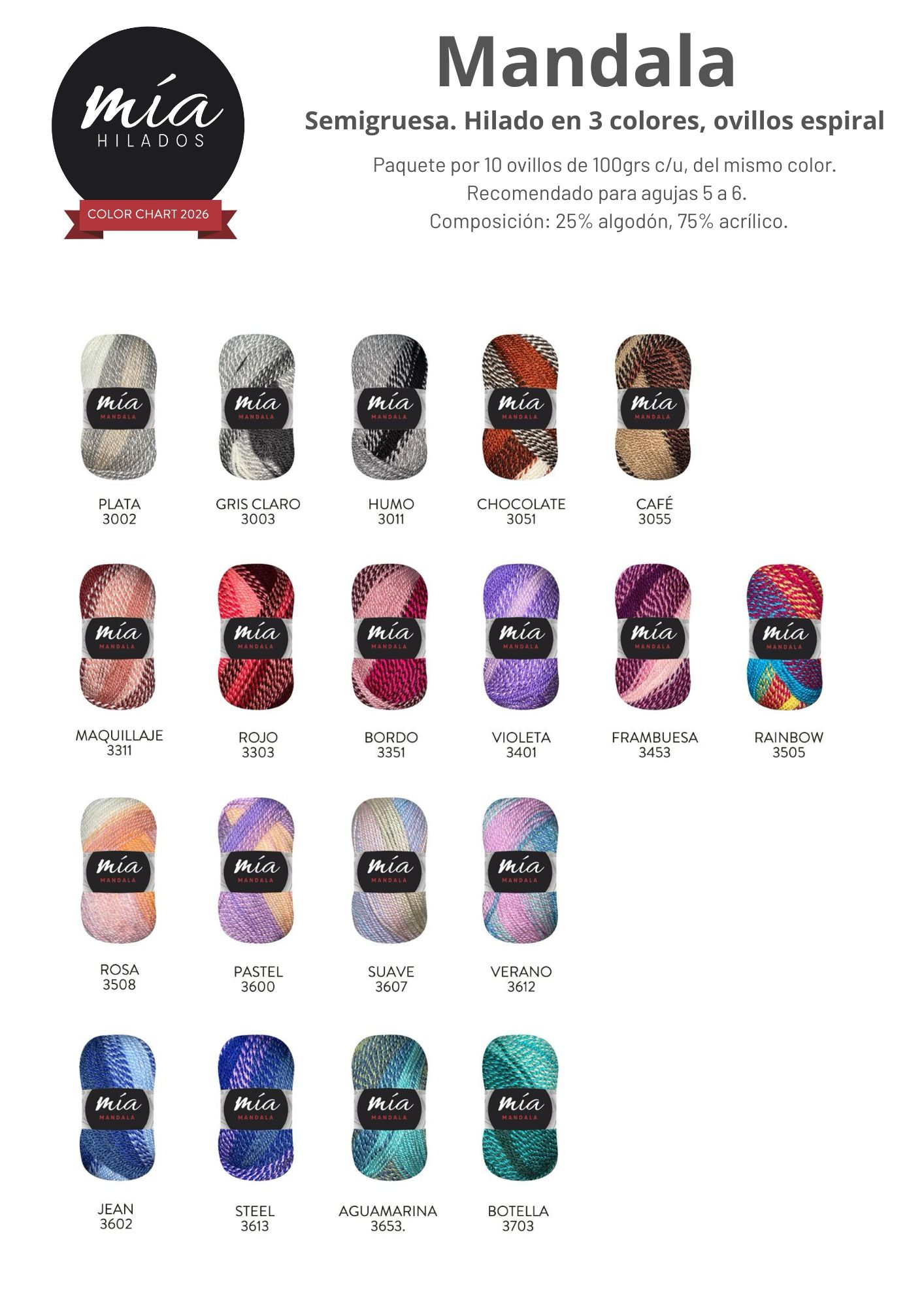 La lana Mía Mandala es semigruesa, compuesta por 100%. Cada ovillo pesa 100grs y está hilado en 3 colores, en ovillos espiral. Se recomienda tejer con aguja nº7.