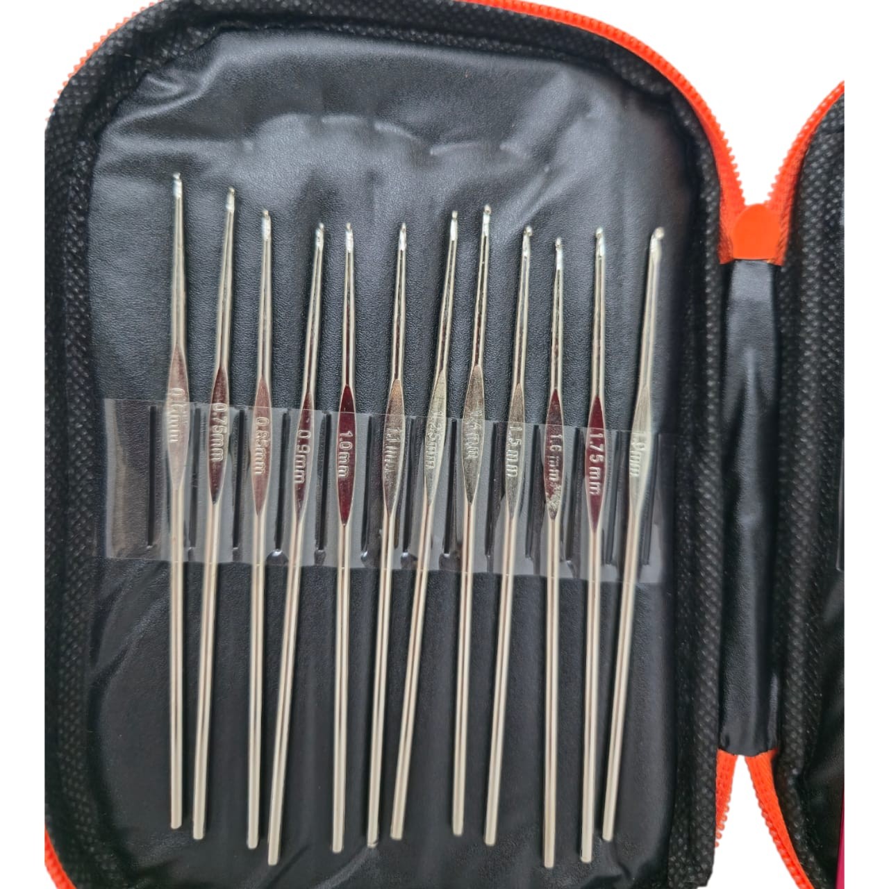 Pack 11 con agujas de aluminio plateadas (en números 0.6mm, 0.75mm, 0.85mm, 0.9mm, 1.0mm, 1.1mm, 1.25mm, 1.4mm, 1.5mm, 1.6mm, 1.75mm, 1.9mm) y 11 agujas de aluminio pintado en números 2.0mm, 2.5mm, 3.0mm, 3.5mm, 4.0mm, 4.5mm, 5.0mm, 5.5mm, 6.0mm y 6.5mm), en cartuchera de cuero ecológico.